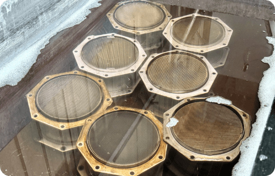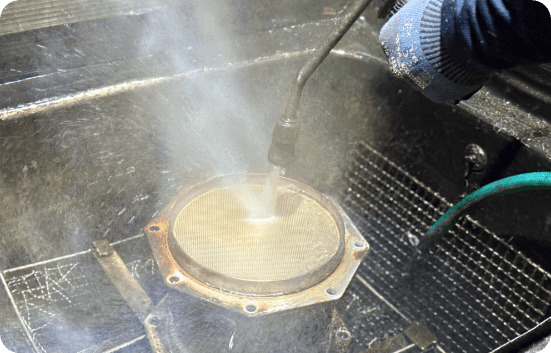 フィルタを特殊溶剤に漬け込み、煤やアッシュを分解する